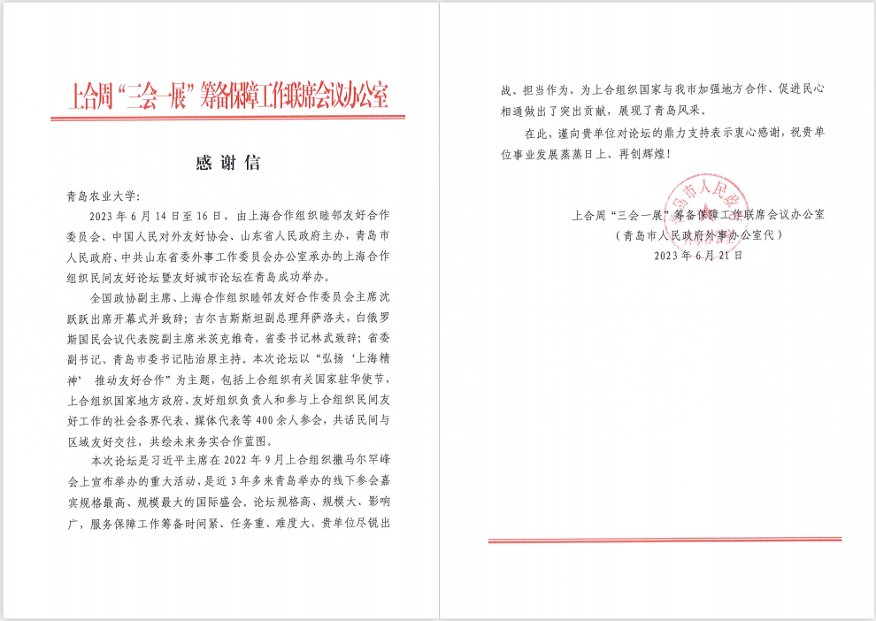 近日,学校收到来自上合周“三会一展”筹备保障工作联席会议办公室的书面感谢信,对我校在青岛国际会议中心举办的上海合作组织民间友好论坛暨友好城市论坛上积极承接的志愿者工作及承训2023年上合组织国家扶贫培训班工作给予充分肯定和感谢,对我校勇担重任、无私奉献的精神进行表扬。信中提到,“论坛规格高、规模大、影响广,服务保障工作筹备时间紧、任务重、难度大,贵单位尽锐出战、担当作为,为上合组织国家与我市加强地方合作、促进民心相通做出了突出贡献,展现了青岛风采”。
