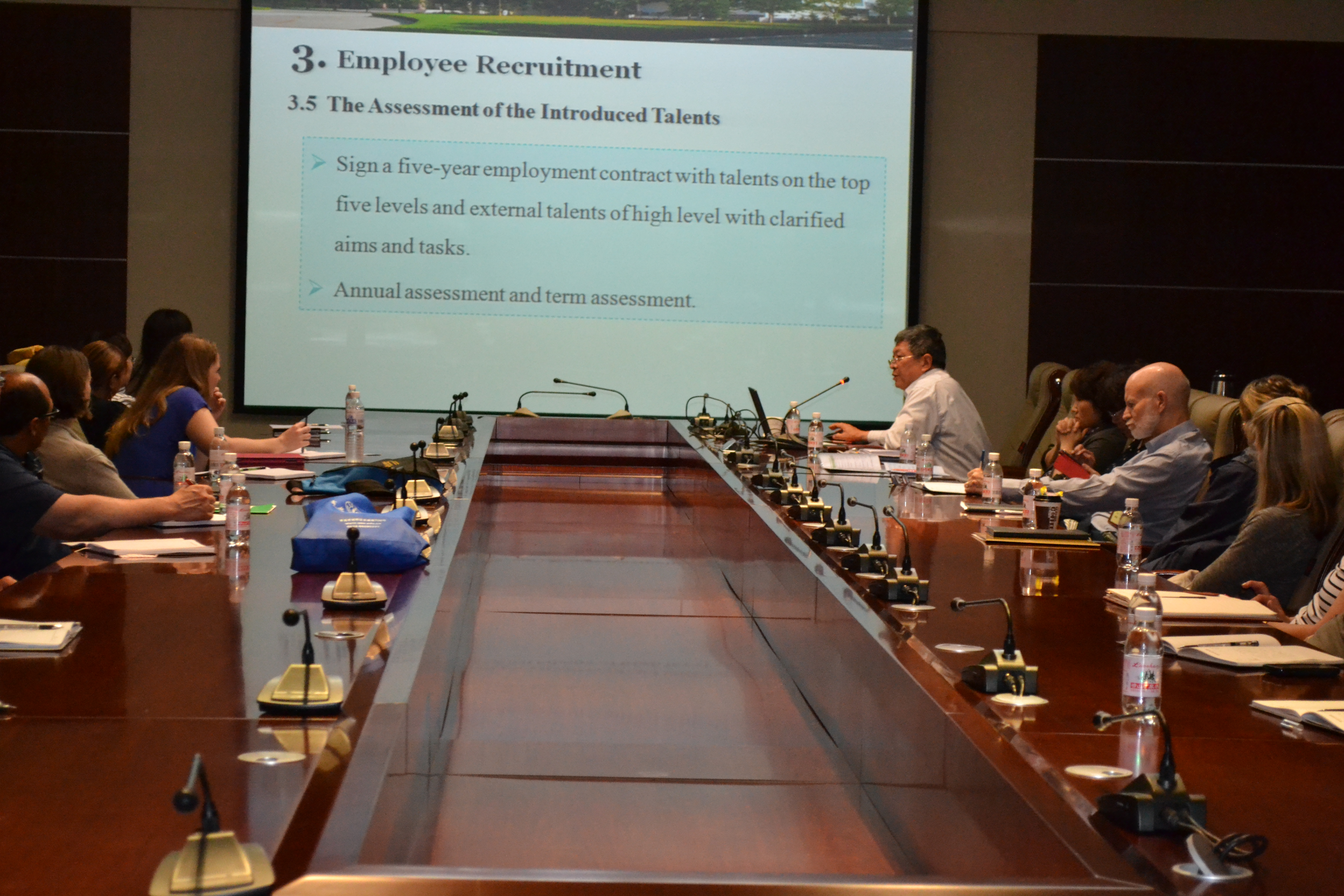 5月28日上午,太阳成集团tyc234cc副校长戴洪义举行专题讲座,介绍了学校人事制度,包括招聘、评定、职称、薪资、人才引进、人才培养等各方面工作,以及学校制定的五年师资结构规划。双方就高等院校的师资聘用与任期等问题进行了交流。