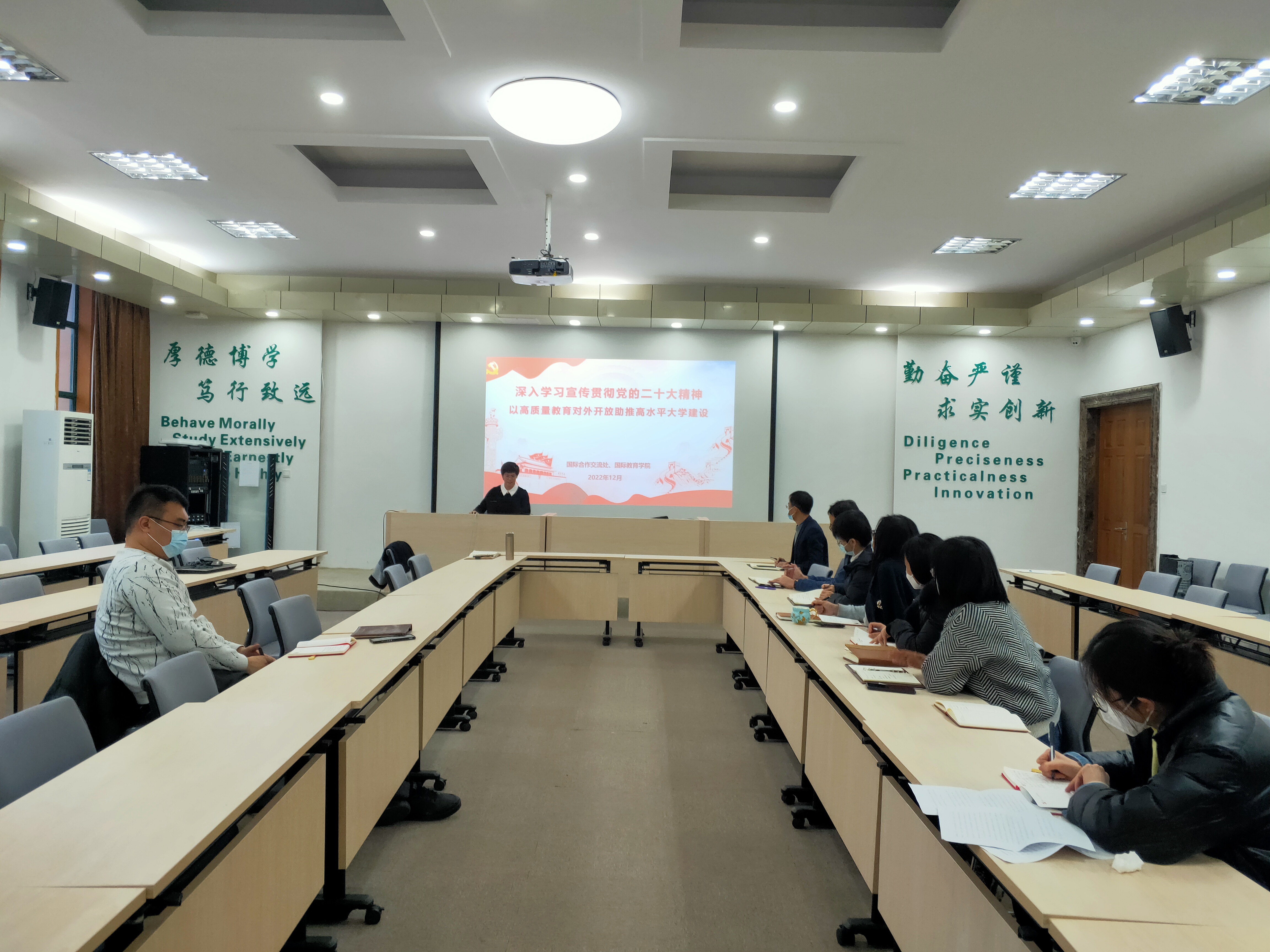 12月8日,太阳成集团tyc234cc处长、国际教育学院副院长许颖在专家楼115报告厅为单位全体教职工宣讲党的二十大精神。