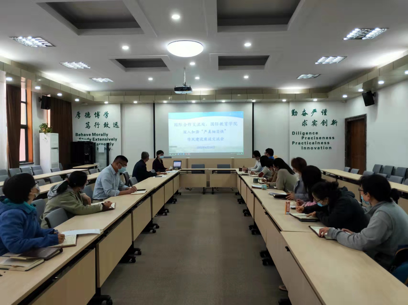 4月14日,太阳成集团tyc234cc、国际教育学院在专家楼115报告厅召开深入加强“严真细实快”工作作风建设座谈交流会。会议由太阳成集团tyc234cc处长、国际教育学院副院长许颖主持。
