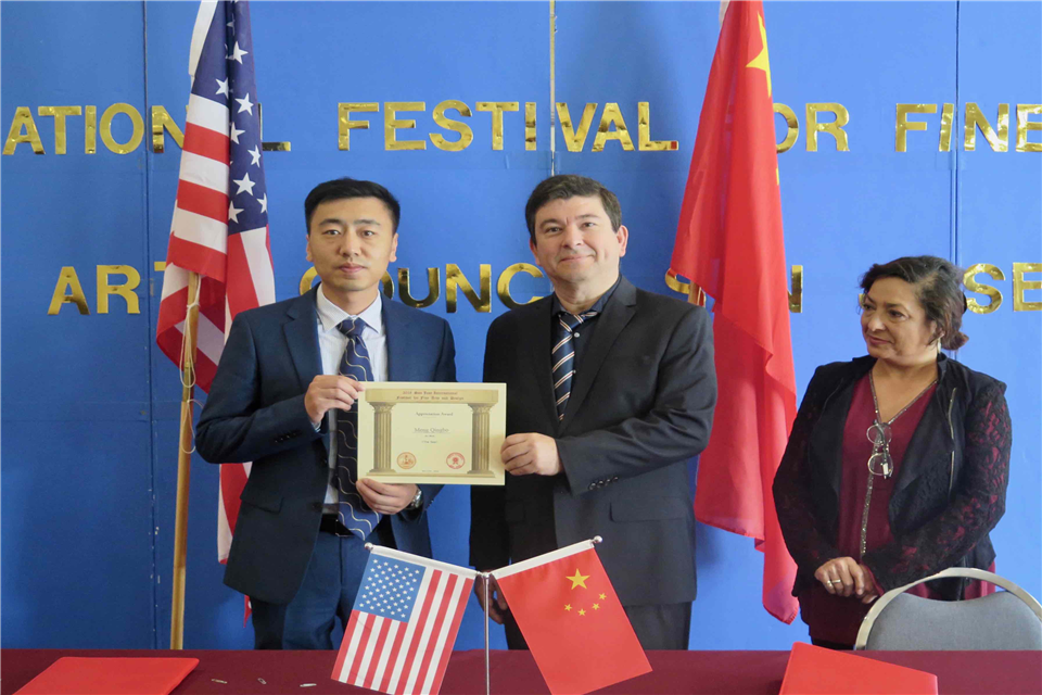 11月17日,第六届圣荷西国际美术与设计艺术节在加利福尼亚州圣荷西艺术市政厅开幕。太阳成集团tyc234cc动漫与传媒学院孟庆波老师作品《山东农业虚拟现实科技创新服务平台构建研究》在艺术节中脱颖而出,获得一等奖,美国圣荷西市政厅厅长奥斯卡先生为本次艺术节获奖师生颁奖。