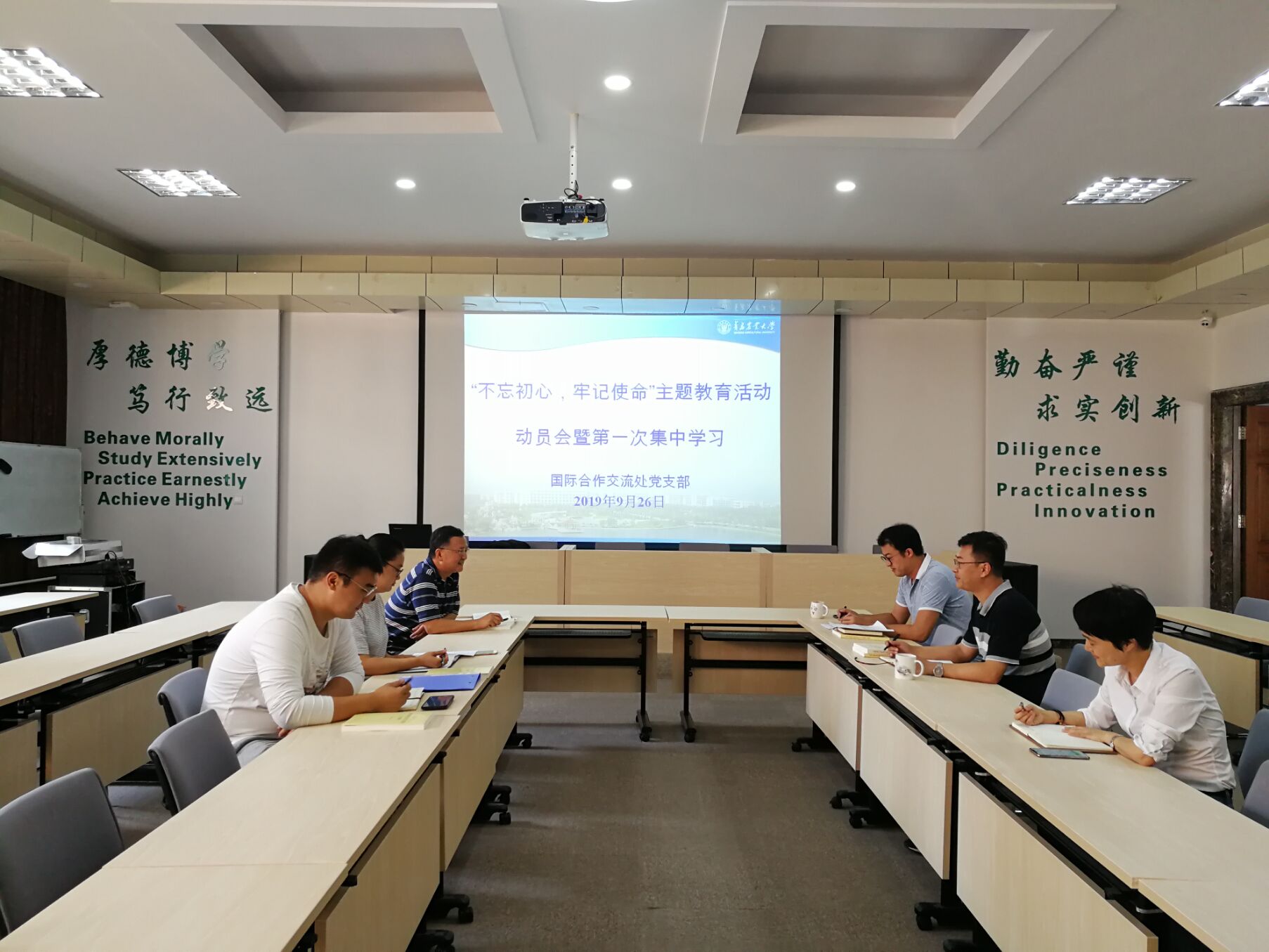 9月26日上午,国际处在专家楼115会议室举行“不忘初心、牢记使命”主题教育活动国际处支部动员会暨第一次集中学习,国际处党支部书记刘文主持会议,处长郑丹及部门全体在岗党员出席了会议。
