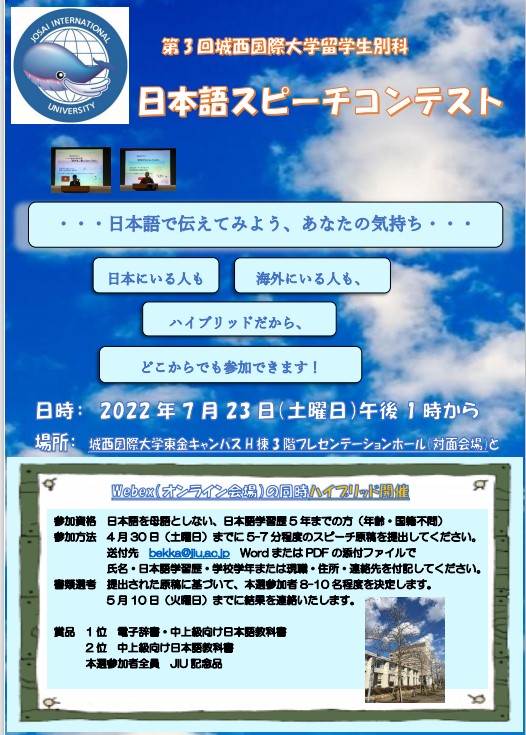 报名方式:请准备5-7分钟日语演讲稿(题目由报名者任选,自己拟定),以word或PDF文档的形式,直接发送到邮箱:bekka@jiu.ac.jp,同时抄送201801130@qau.edu.cn。